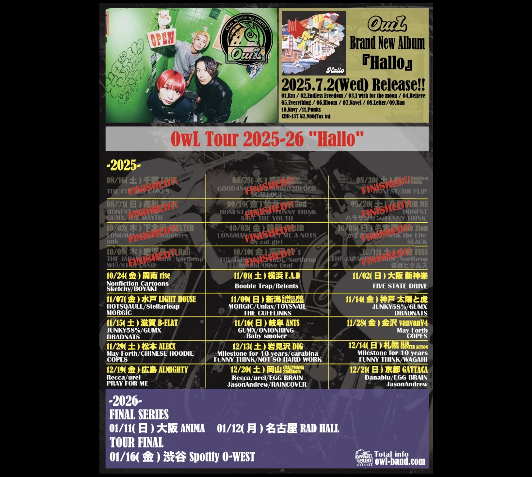 ■TICKET: チケット代 前売り ¥3,000 当日券 ¥3,500ー ※1drink代別途¥600-必要 チケットはOwLオフィシャルサイトで予約可能 ■ARTIST: OwL JUNKEY58% GUMX DRADNATS |