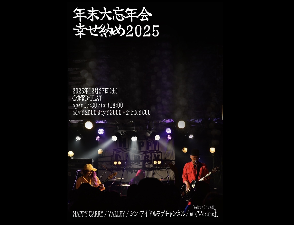 ■TICKET: adv ¥2500 day ¥3000 +drink ¥600 B-FLATのチケット予約フォームからもご予約可能 ■ARTIST: HAPPY CARRY / VALLEY / シン・アイドルラブチャンネル / mof crunch |