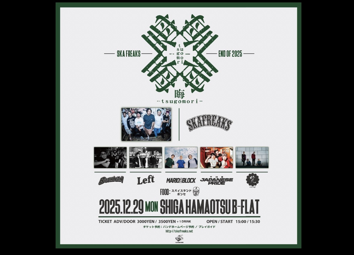 ■TICKET: 前売¥3,000- (1drink代別¥600-) チケット予約は skafreaks.net ■ARTIST: SKA FREAKS Bushman Left MARIO2BLOCK THE JAPANESE PRIDE 梵 -soyogi- OPENING ACT:GORI(SCOTLAND GIRL) FOOD:スパイスランドポンセ |